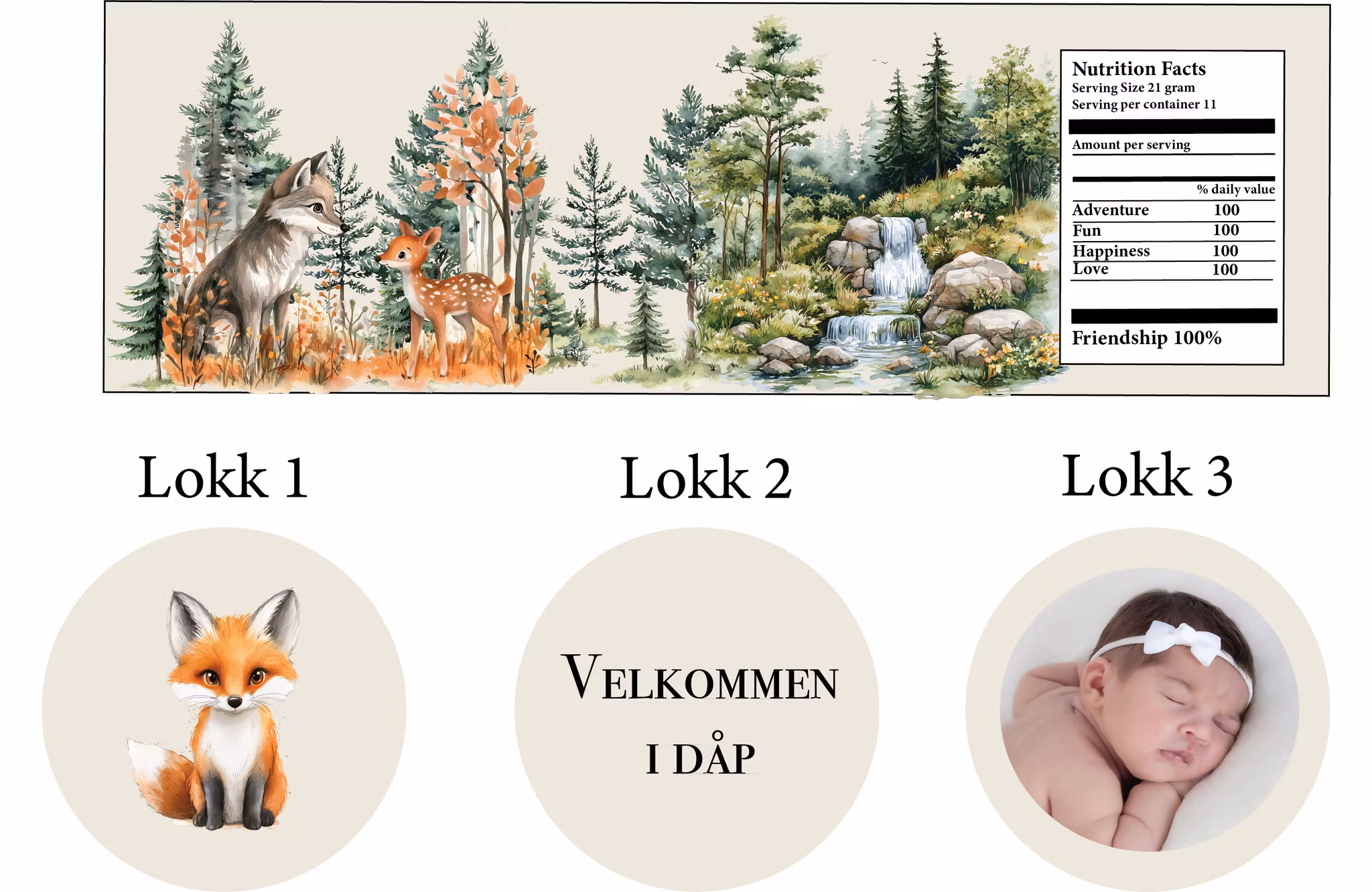 Du mottar A4 ark med 2 etiketter på hvert ark, og A4 ark med 6 lokk, og du må selv klippe dem ut. Brett etiketten rundt boksen og fest med gjennomsiktig teip på baksiden, eventuelt dobbeltsidig teip for å skjule teipen. Den runde etiketten legges inn i lokket.